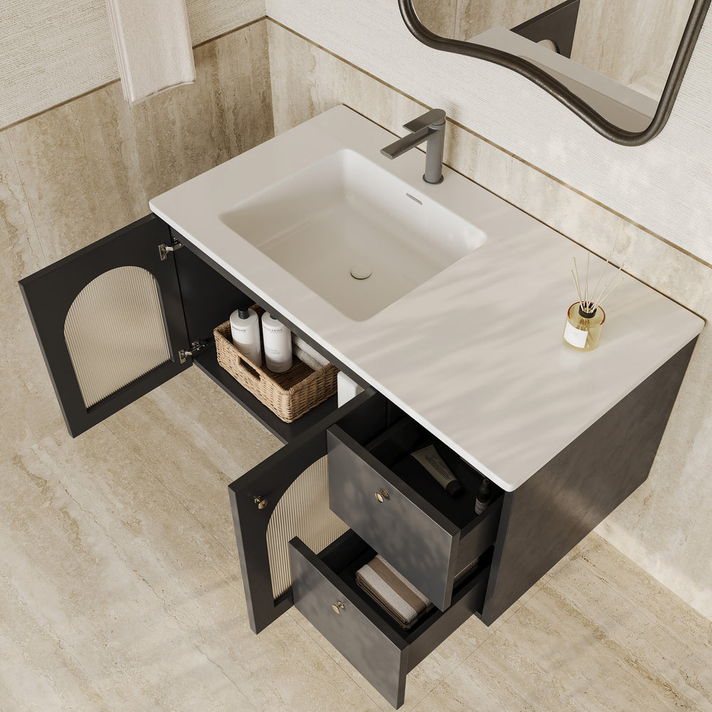 Includes a smooth, durable composite stone basin for easy everyday maintenance.